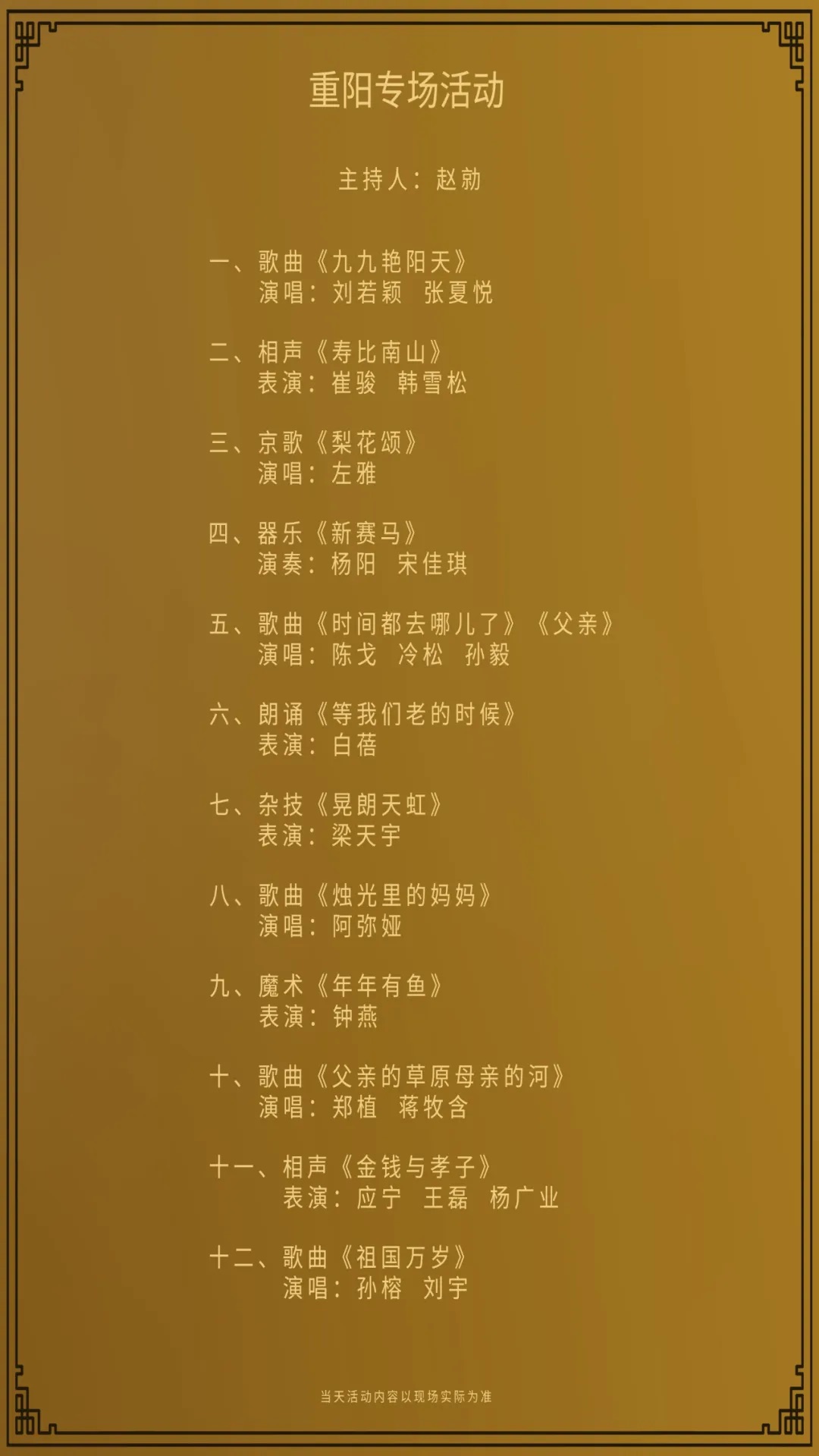 值此金秋十月,我馆与中国煤矿文工团合作,为广大观众呈现一场精彩纷呈的重阳节专场活动。观众将通过艺术家们的精彩表演,重温《九九艳阳天》《烛光里的妈妈》《时间都去哪儿了》等经典旋律,欣赏京剧《梨花颂》中优美的戏曲唱腔,感受二胡演奏《新赛马》中骏马奔腾的恢宏景象。此外,相声、朗诵、杂技、魔术等表演内容也将逐一呈现,带来欢声笑语的同时,让更多观众领略重阳节深厚的文化内涵。