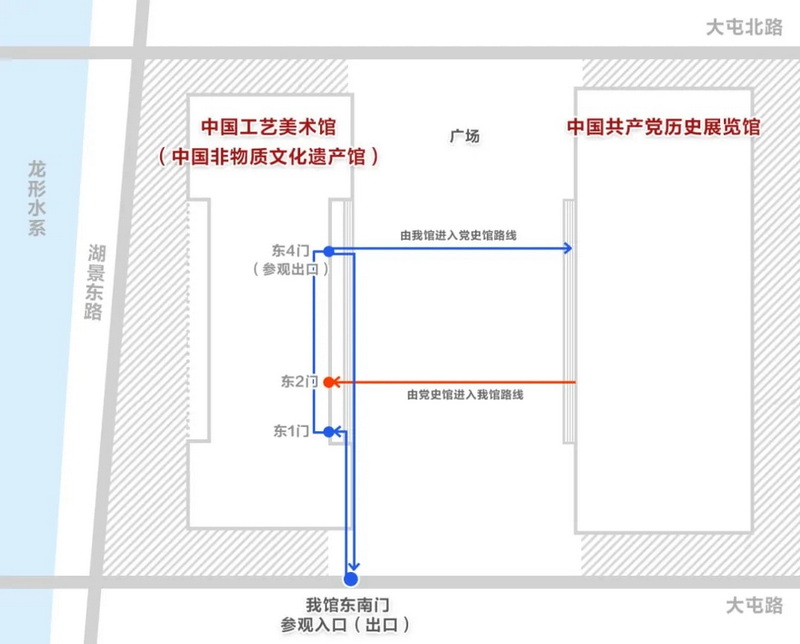 为满足广大观众的参观需求,自2025年1月1日起,中国工艺美术馆(中国非物质文化遗产馆)与中国共产党历史展览馆(以下简称“党史馆”)实现互通参观,即预约一馆,可参观两馆。
