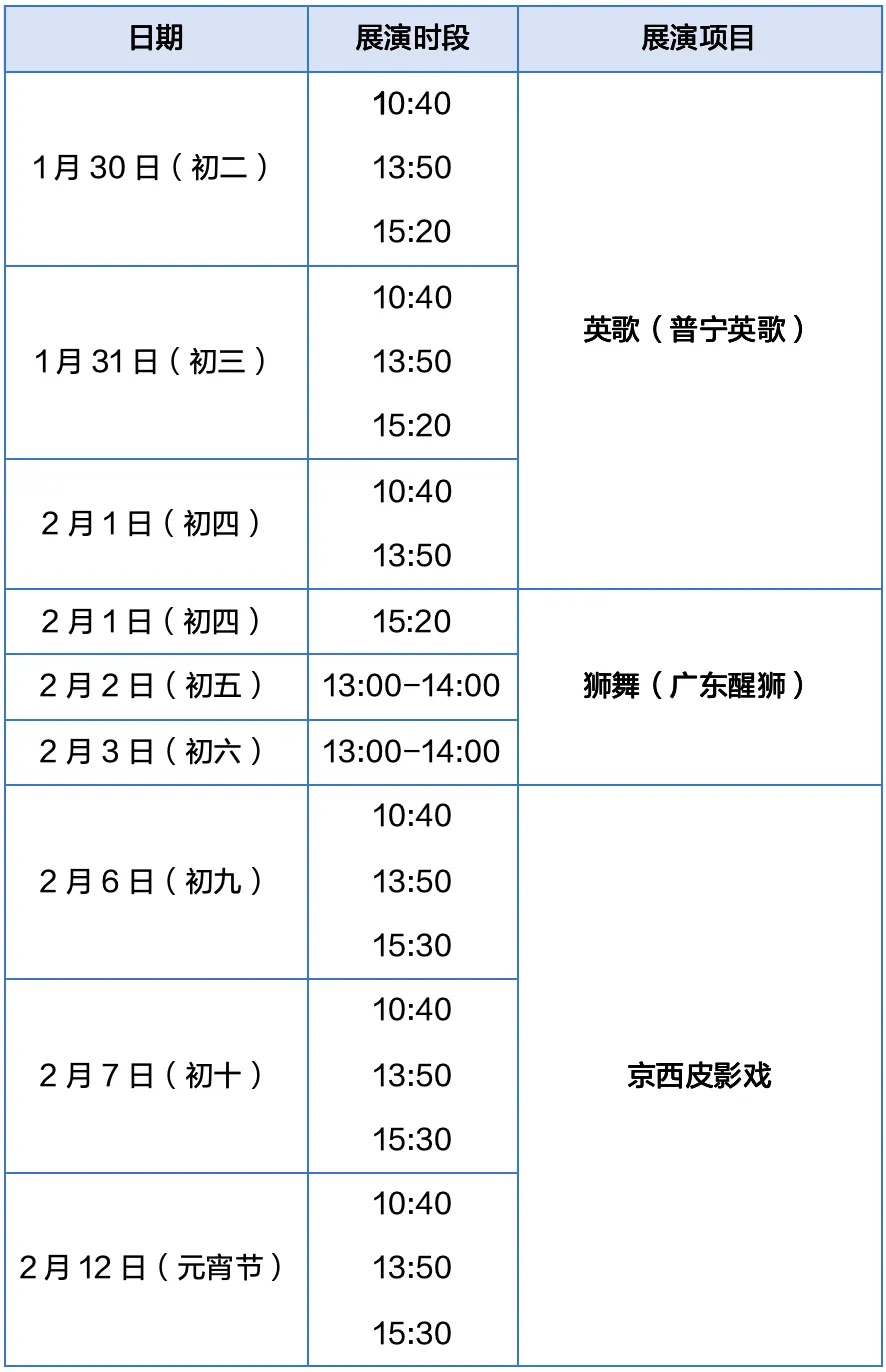 为满足广大观众的假期文化需求,我馆将在2025年1月30日(初二)至2月12日(元宵节)期间在“过年——春节主题展”展厅举办系列展演活动,值得一提的是,在央视春晚舞台大放异彩的普宁英歌,也将来到中国非物质文化遗产馆。请您于活动当日提前至展厅“村晚大舞台”处等候,具体展演项目及相关信息详见下方列表。