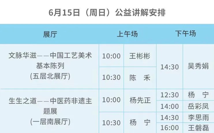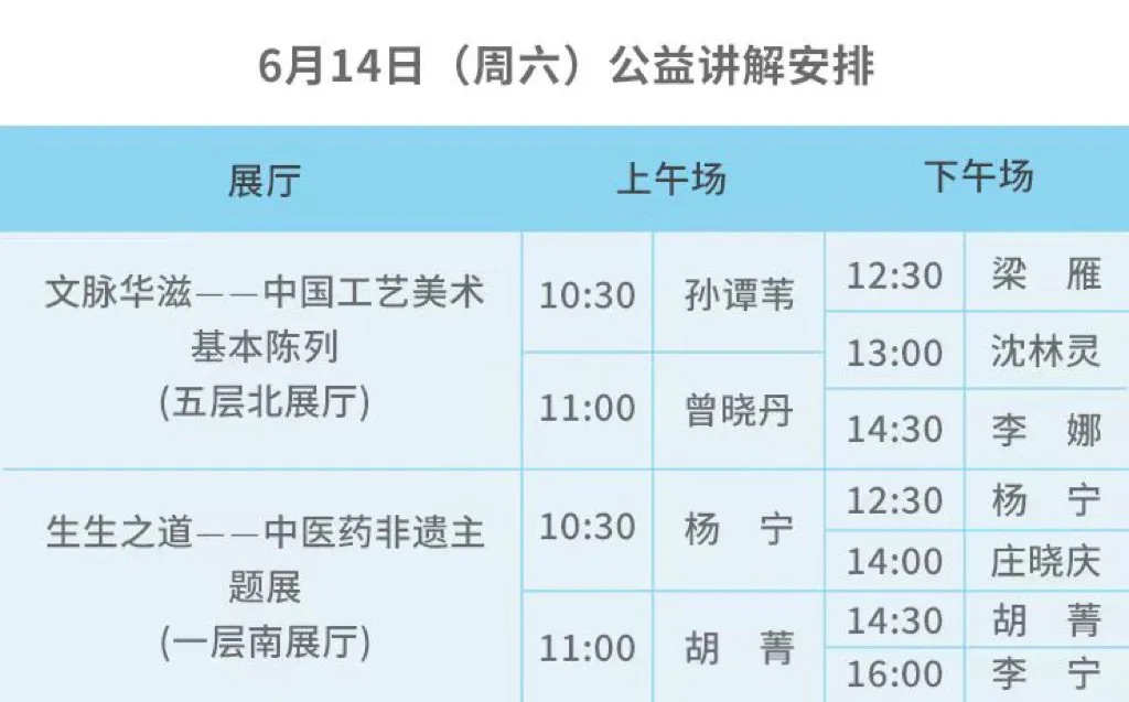 “文化和自然遗产日”期间,我馆志愿讲解员将为观众提供公益讲解服务,带您深入了解展品背后的故事。具体内容可参考下表并请留意我馆北侧咨询台公益讲解公告,提前至相应展区起始处等候。