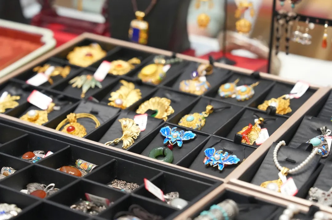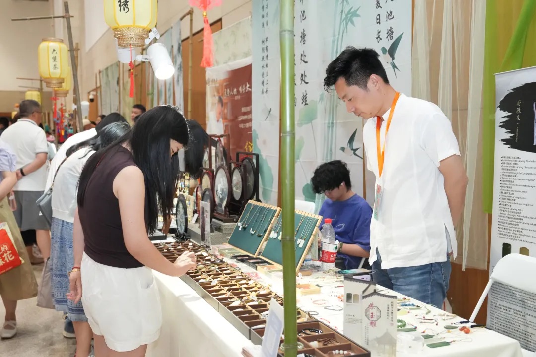 本次市集邀请了来自浙江、福建、山西、江苏、河北、河南、广东等多个省市的传承人现场展示,汇聚了宋锦织造技艺、玉雕(苏州玉雕)、平遥推光漆器髹饰技艺、苗绣、花丝镶嵌制作技艺等40余项非遗技艺,打造了集体验、互动、销售为一体的“非遗+”平台,为市民游客带来一站式文化休闲新体验。