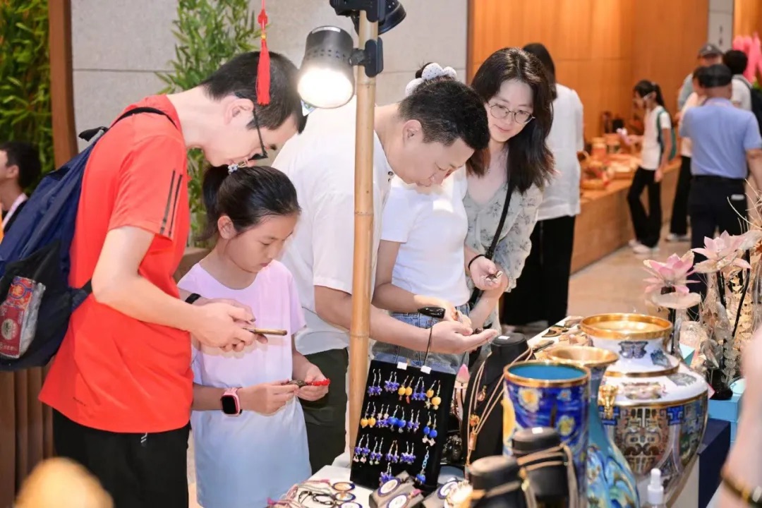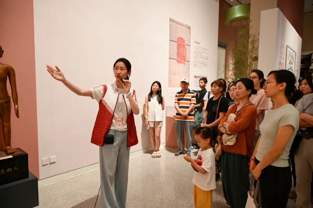 与此同时,我馆各层展览也吸引着观众驻足观赏。馆内同步开展的公益讲解服务,让展品背后的历史故事、文化寓意与工艺技法变得鲜活生动。讲解员娓娓道来,观众们认真聆听,不时提问交流,在互动中深入领略中华传统工艺的博大精深。