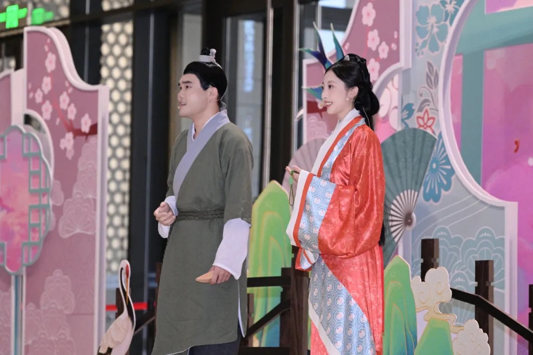 步入大厅,便能感受到浓郁的七夕氛围。只见“牛郎”“织女”“月老”等NPC们身着传统服饰,生动演绎“鹊桥相会”的经典传说。细腻的肢体语言与生动的情节编排,让流传千年的爱情故事变得鲜活生动。演出间隙,还有“月老”互动环节——猜七夕灯谜、对古典诗词,老少观众绞尽脑汁、踊跃参与,在趣味互动中品读传统文化韵味,现场欢声笑语不断。“今天和孩子一起猜灯谜、对诗词,才知道七夕节背后有这么多文化故事,既热闹又长知识。”带孩子参与活动的王女士感慨道。