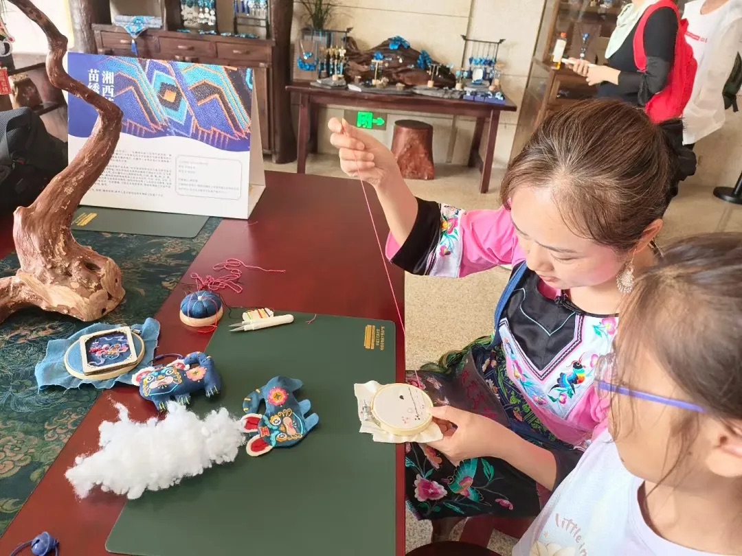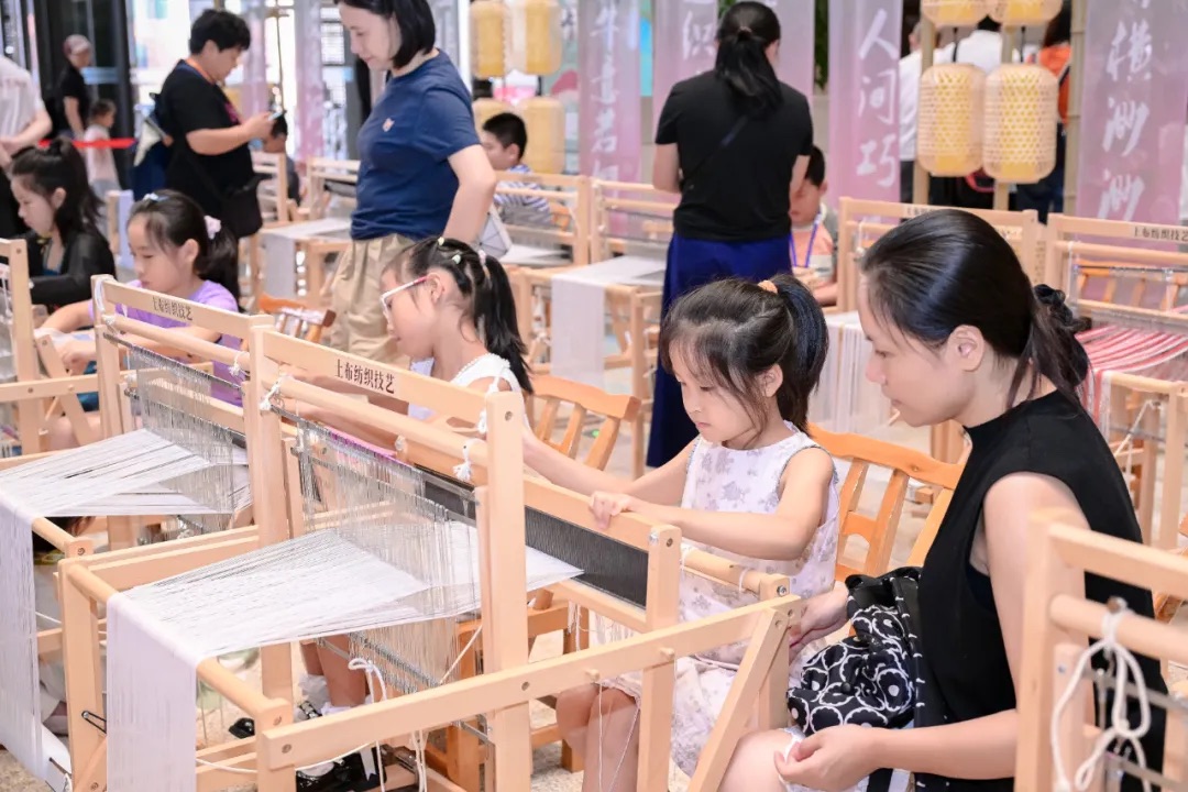 四层非遗手工艺体验中心的“乞巧传匠心”专场,让观众亲身触摸传统技艺的温度。作为七夕习俗之一的“乞巧”,承载着古人对巧手与美好生活的向往。活动现场,苗绣的绚丽纹样、宋锦的精致提花、土布纺织的质朴纹理一一呈现,吸引了众多观众参与。观众们围坐桌前,或穿针引线,或执梭编织,在亲手制作中体会“家家乞巧望秋月,穿尽红丝几万条”的民俗意趣。