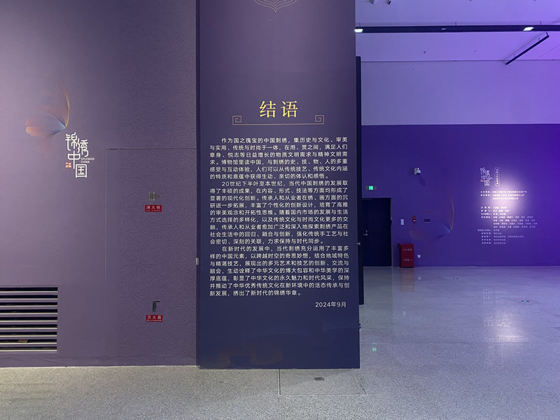 “锦绣中国——刺绣公共教育展”入选国家文物局、中央网信办主办的“2024 年度博物馆里读中国——弘扬中华优秀传统文化、培育社会主义核心价值观”主题展览推介项目。该展览汇集了全国多地区、多民族,具有代表性、典型性的刺绣作品在当代传承、创新、融合的优秀成果,分作“黄河铺绮绣”“长江驭锦鸾”“木棉绽粤江”“丹曦映北国”“鱼龙舞南溟”五大单元,系统展示出不同地域、不同时期代表性绣种的源起与流变,以作品结合工具、材料、文献、互动体验等方式进行展出,旨在生动、全面地呈现中国刺绣的发展脉络和当代面貌,揭示它独特的文化内涵、文化传统和艺术魅力,解读其所蕴含的中华民族传统美德。通过讲述中国刺绣所承载的中华民族多元一体的故事、赋能民族地区脱贫攻坚和乡村振兴的案例,相信刺绣也将在推进中国式现代化进程中续写新的辉煌。