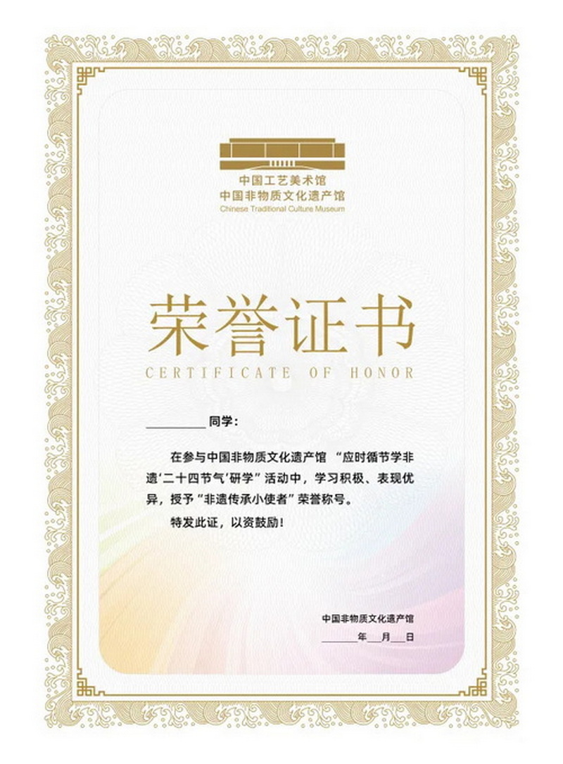 2024年,我馆共组织14期“应时循节学非遗:‘二十四节气’研学”活动,冬至篇为本年度最后一期活动,我们将为累计参加7次及以上的学员颁发“非遗传承小使者”证书并赠送礼品一份。