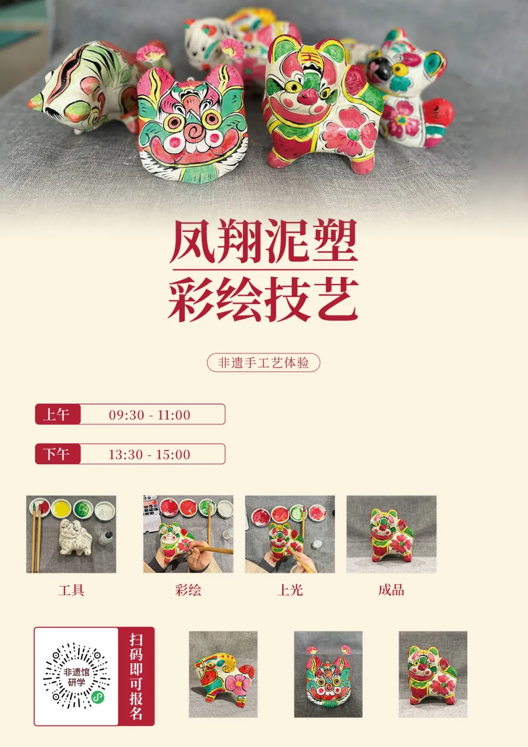 本课程中,观众将了解凤翔泥塑的历史发展脉络、造型艺术特点、制作技艺流程,体验彩绘、上光等工艺,触碰千年的文化脉络,创作出形象生动的泥塑作品。