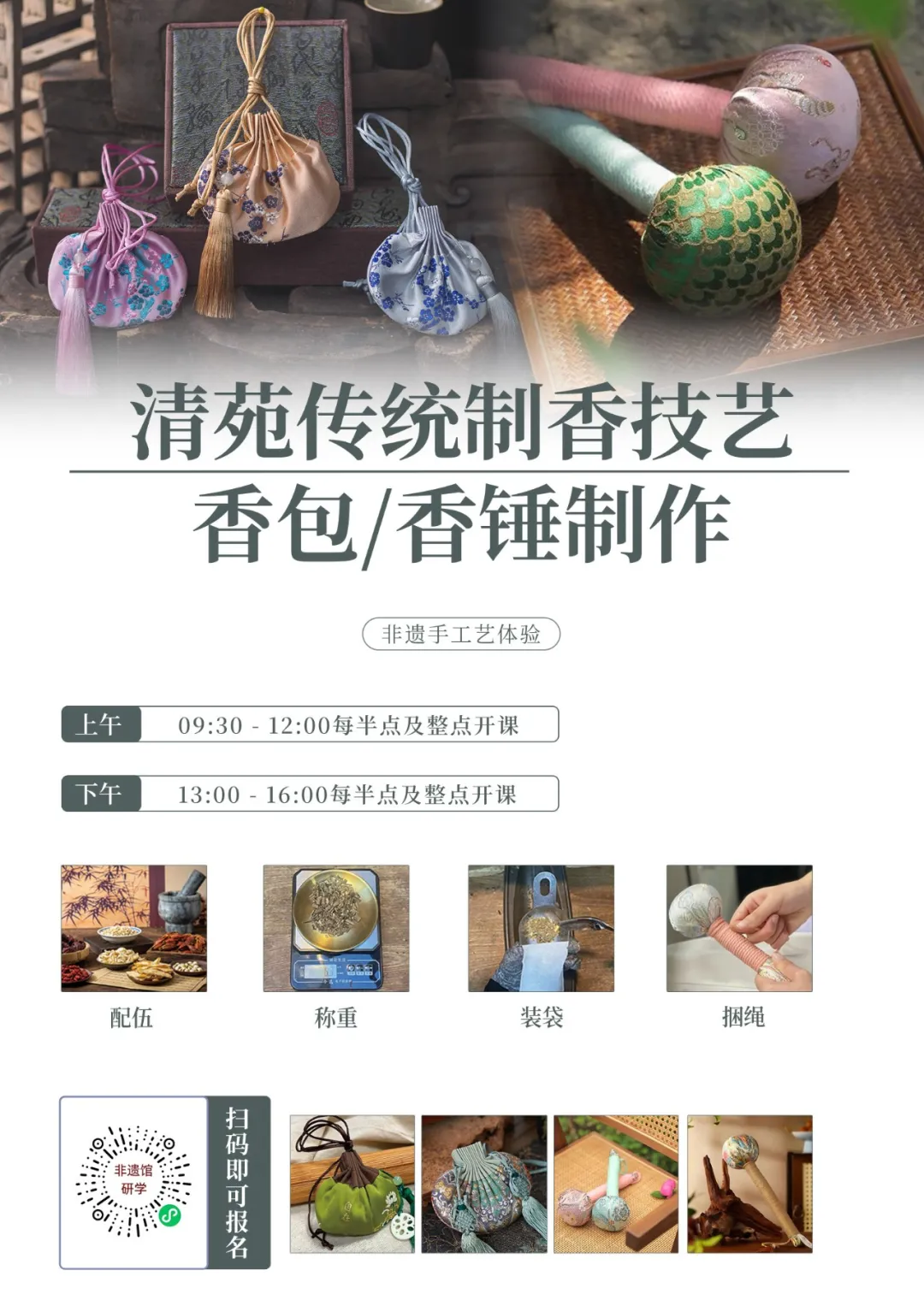 本课程中,观众将以香为媒,了解中国传统香文化,通过选料、配料等工序,制作香包、香锤、香牌、香珠,体验制香的乐趣。