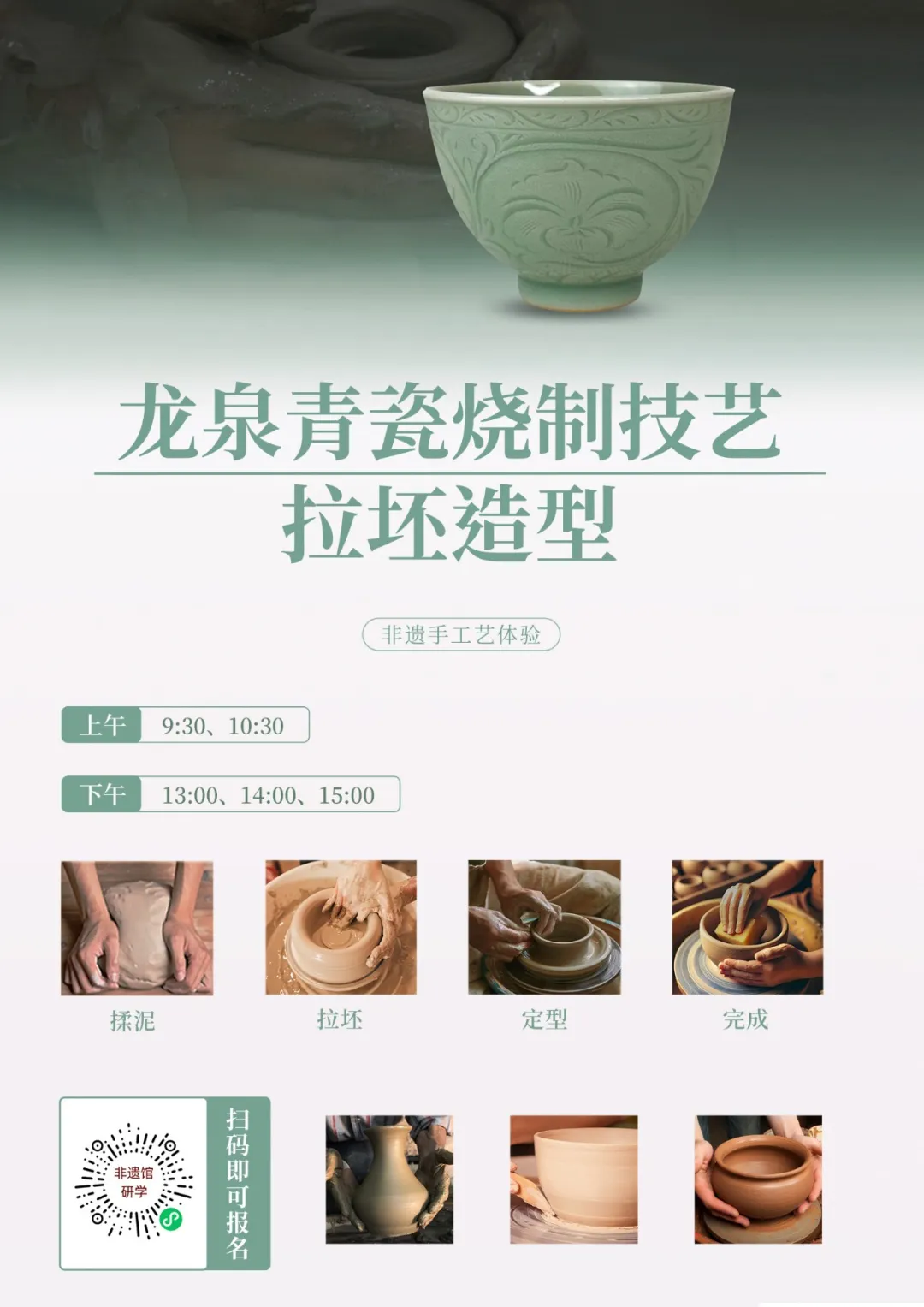 本课程中,观众将了解龙泉青瓷的发展历史和烧制技艺,学习拉坯基础手法,包括揉泥、找中心、开孔等,让参与者在触摸中充分激发灵感和创造力。