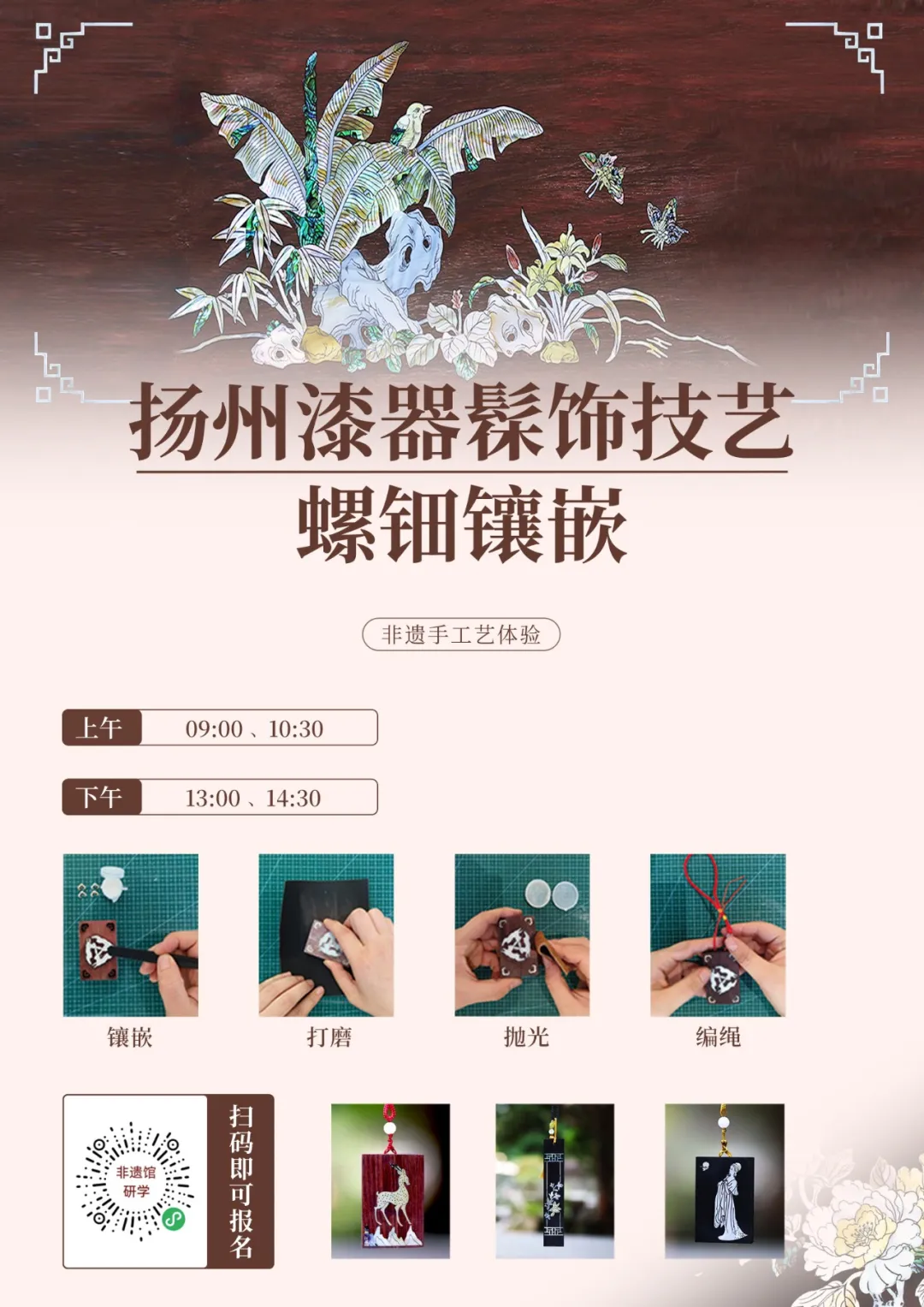 本课程中,观众将了解扬州漆器髹饰技艺的历史发展脉络和工艺种类,通过镶嵌、打磨、抛光等工序,亲身体验技艺的精妙,完成一件心仪的螺钿镶嵌作品。