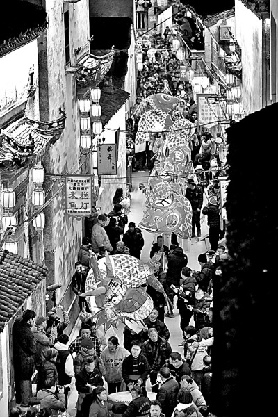 安徽省黄山市歙县北岸镇瞻淇村鱼灯队在村里表演。新华社发