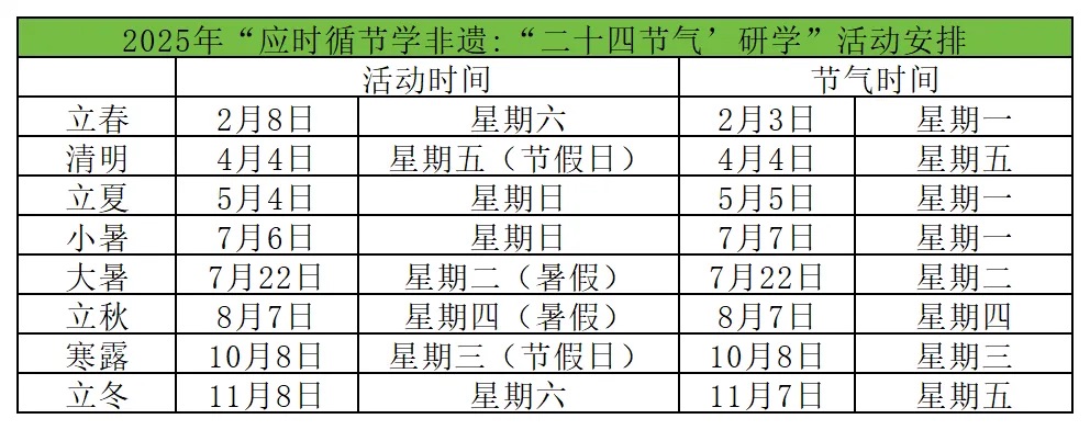2025年,我馆将组织8期“应时循节学非遗:‘二十四节气’研学”活动,学员累计参加6次及以上,将获得由我馆颁发的“非遗传承小使者”证书。
