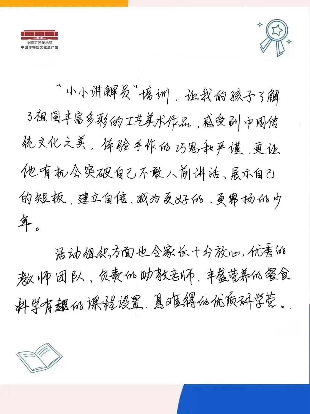 在往期“小小讲解员”培训课程中,学员们在与老师、观众的互动交流学习中,化身为传播中华文化的小使者,全面提升了社会交往、自主学习、语言表达、文字组织、待人接物五大能力。课程收获了家长们的一致好评: