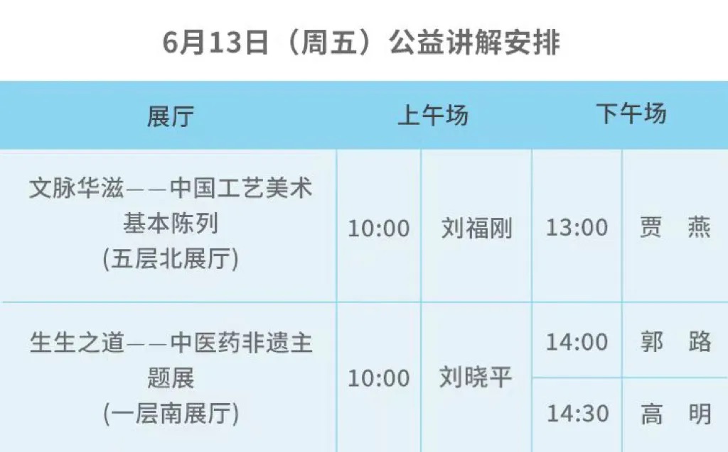 “文化和自然遗产日”期间,我馆志愿讲解员将为观众提供公益讲解服务,带您深入了解展品背后的故事。具体内容可参考下表并请留意我馆北侧咨询台公益讲解公告,提前至相应展区起始处等候。