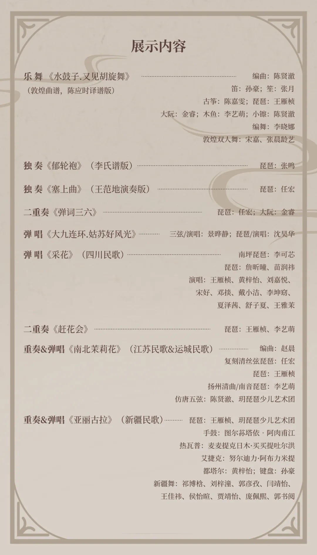 本场活动我馆邀请到中国艺术研究院音乐研究所、中央音乐学院、中央民族大学等专业演奏家、曲艺演员们。老中青少四代表演者将齐聚一堂,通过乐舞、独奏、弹唱、舞蹈等丰富多样的艺术形式,为大家带来《塞上曲》《采花》《亚丽古拉》等精彩节目。