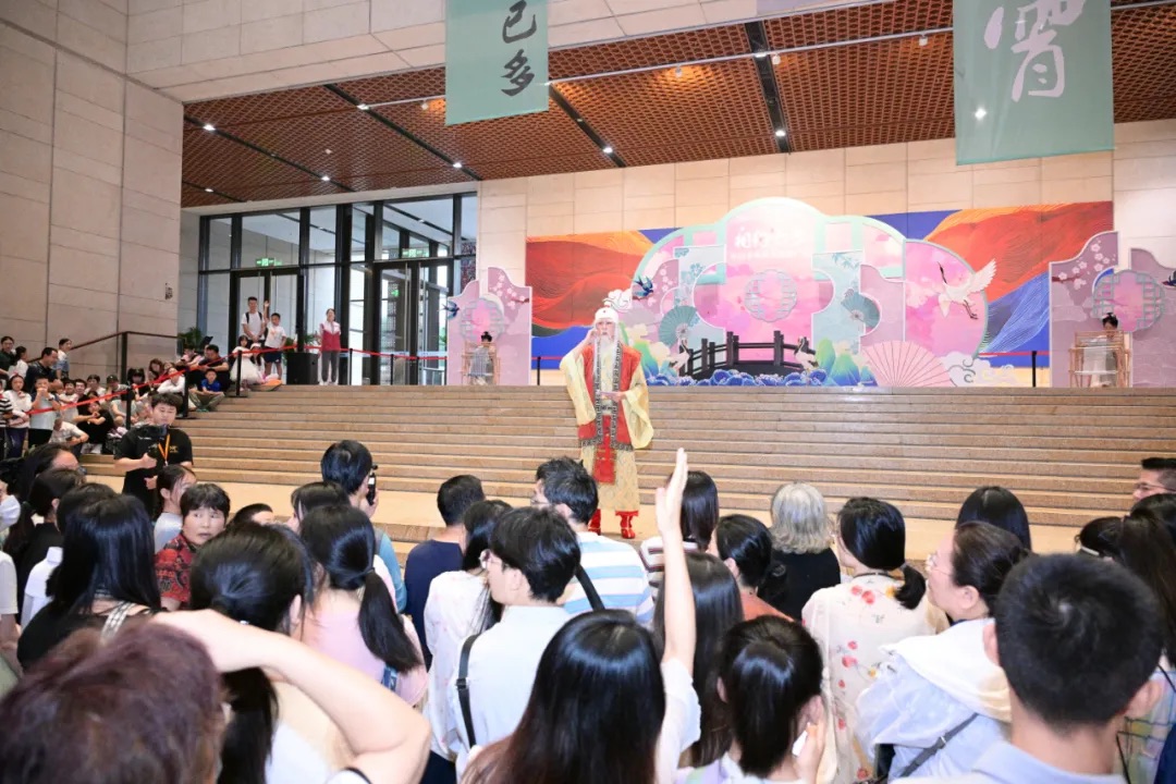 一旁的多功能厅内,“戏韵七夕”赣剧社教活动精彩上演,为节日增添了浓厚的戏曲风情。作为2011年列入第三批国家级非物质文化遗产代表性项目的赣剧,以激越明快的声腔、生动传神的表演著称。活动中,江西省乐平市赣剧团带来《陈姑赶船》《李迩王》《对花枪》等经典剧目,演员们唱腔婉转、身段优美,将传统戏剧的魅力展现得淋漓尽致。台下观众屏息倾听,不时为演员们的精彩表演报以热烈的掌声与喝彩声,现场戏曲氛围十分浓厚。