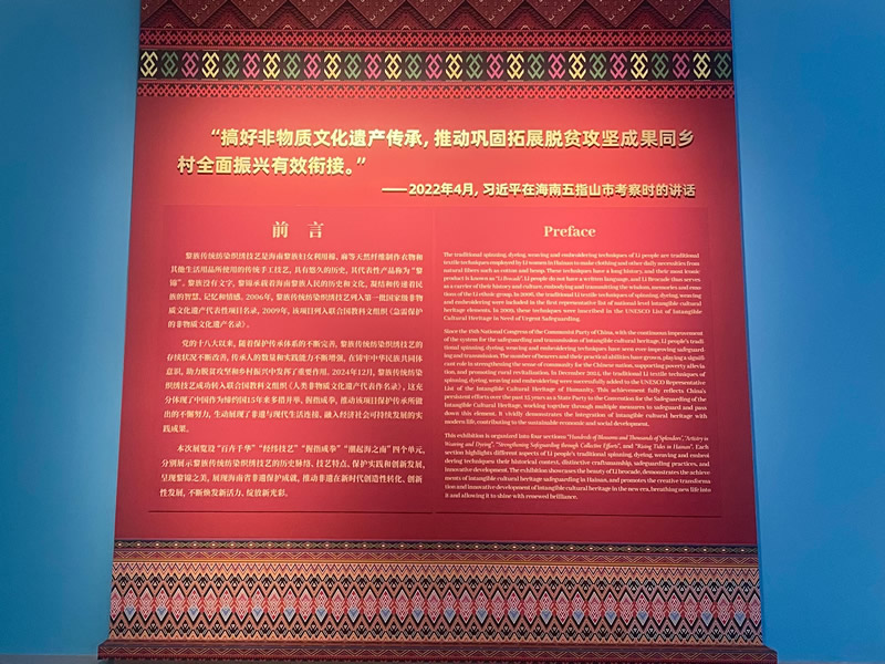 本次展览设“百卉千华”“经纬技忆”“握指成拳”“潮起海之南”四个单元,分别展示黎族传统纺染织绣技艺的历史脉络、技艺特点、保护实践和创新发展,呈现黎锦之美,展现海南省非遗保护成就,推动非遗在新时代创造性转化和创新性发展,不断焕发新活力、绽放新光彩。